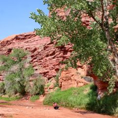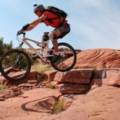 Comme toujours, on apprécie la fraîcheur matinale, toute relative car nous sommes encore à l’ombre de la falaise Est des gorges. On remonte un demi mile de piste pour arriver à un chemin balisé qui descend dans le lit d’une rivière affluente du fleuve. A froid, cette courte descente en entrée est un vrai challenge de blocs que l’on préfère franchir à côté du vélo, mais je ne résiste pas à sauter la belle marche minérale de 3 pieds qui la termine.
