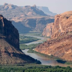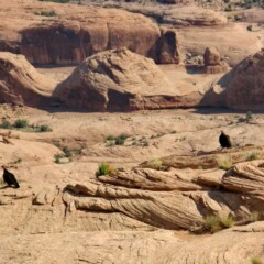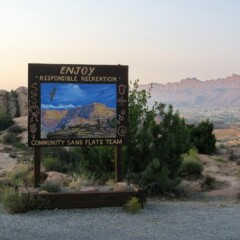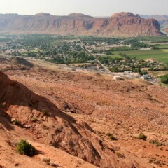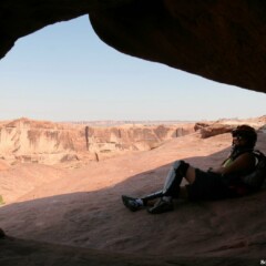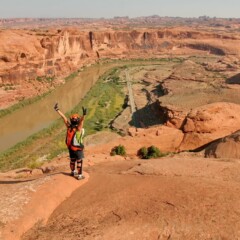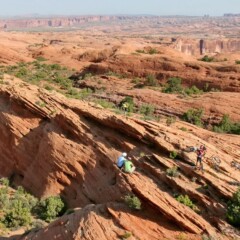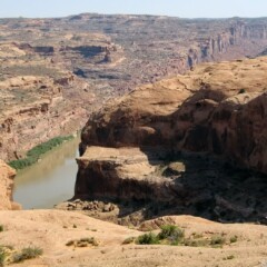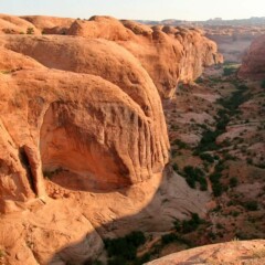 Ici, vue imprenable à tous les virages. D’abord les formes presque liquides de la roche, sa couleur ocre plus ou moins claire, ses ilots de verdure dans des trous de sable formant des ovales ou des cercles parfaits. Les vues lointaines vers le désert et ses formations minérales verticales. Et bien sur les vues plongeantes aux détours de la boucle sur la faille de Moab, le canyon de la rivière Colorado, ou les plus petits Abyss et Echo canyons. Et puis la lumière, au lever ou au coucher du soleil.