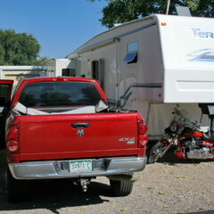 Puis un pickup arrive. Le gars monte son vélo rigide, une sorte de dirt bike, et on le reconnaît aussitôt avec ses tatouages de vélo plein les bras, ses boucles d’oreilles et ses lunettes d’inspecteur Derrick, c’est le cuistot du Hot Tomato Cafe, le super petit resto pizzeria en face du célèbre bike shop de Fruita, Over The Edge Sports, où on a apprécié à deux reprises les méga salades à toute heure et la bière. Plutôt timide, il s’en va aussi de son côté.
