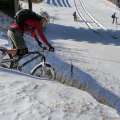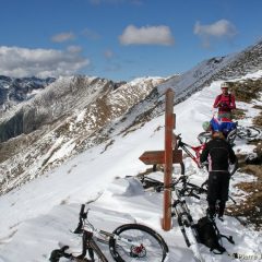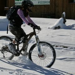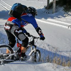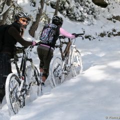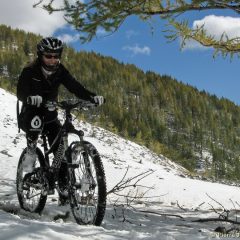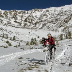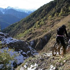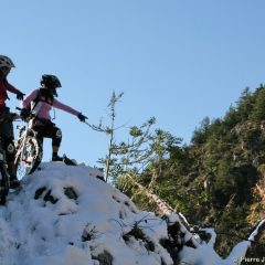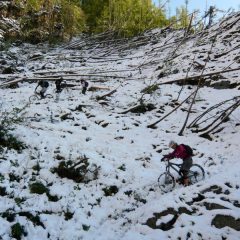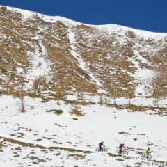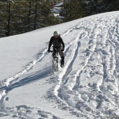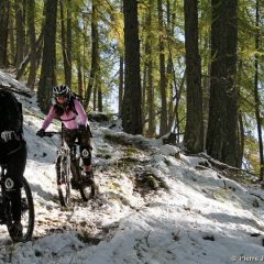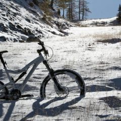 On se souhaite le bonjour, et on repart pour l’habituel jardinage sous la bergerie pour retrouver la trace du sentier, déjà peu évidente en conditions normales. Une fois dessus, on ne peux plus le perdre, le troupeau est monté par là et a bien fait ressortir la terre boueuse sous la couche de neige fondante. Mais il est plutôt sale, glissant, et les animaux à poil laineux sont un peu comme certains pilotes vététistes, ils font des coupes et ne respectent pas le sentier ! Bref, la descente déjà naturellement technique devient ici un vrai challenge d’équilibriste.