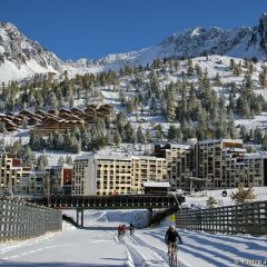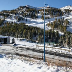La fin de montée en voiture glissouille bien, les saleuses sont en plein travail. Mais une fois dans la station, c’est l’émerveillement avec toute la montagne fraichement repeinte en blanc, et surtout une tranquillité tellement inhabituelle dans ce contexte ! On monte les vélos et on se couvre en même temps, le soleil encore bas chauffe peu, et le thermos de café préparé par Banana est une aubaine.