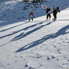 Rapide calcul : +400m environ à pousser, avec un peu de portage dans les dernières parties plus pentues, après tout c’est pas la mort (même avec trois géraldines dans le groupe 😉 ). D’ailleurs, celui qui hésite le plus est Franco, ses mollets poilus ont déjà viré au rose, tandis qu’il ne sent déjà plus ses pieds !