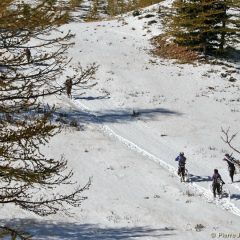 A l’attaque de la montée finale vers la baisse, on est dans un paradoxe : la neige a été partiellement soufflée de la face et des éboulis, mais elle s’est accumulée sur l’unique chemin, ce qui rend du coup la progression plus physique. On en profite pour faire la pause pique nique au soleil, et surtout sans vent, face au panorama somptueux de la Lombarde, du Malinvern et de la cime de Tavel.