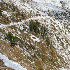 Le début du chemin des italiens est encore roulant, mais on se rend vite compte que cela ne durera pas. Le large sentier est bien chargé, même sous les arbres, et l’or jaune des mélèzes se fait rare. Nous étions venu pour ses couleurs chaudes, et c’est l’hiver qui nous accueille.