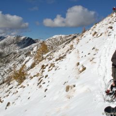 L’arrivée dans le vallon sous la cime de Méné est un vrai carnage. L’une des nombreuses avalanches de neige lourde de l’année passée a laissé une énorme cicatrice toujours pas refermée et la petite forêt de feuillus a laissé la place à un enchevêtrement de troncs et de branches, à peine dégagés pour laisser le passage sur le sentier.