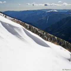 Contournement de la barre bétonnée pour éviter de monter par le front de neige, et dès les premiers pas freeride hors du bitume, on prend conscience qu’il est tombé une sacrée couche, et ça confirme ce que disait le local rencontré plus tôt : Il était allé faire son footing à la baisse de Merlier la veille, et s’était fait surprendre par la neige en fin de journée, des bourrasques qui n’avaient pas cessé de toute la nuit ! Bref, 20 cm de bonne poudreuse, et plus dans les accumulations dues au vent violent.