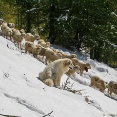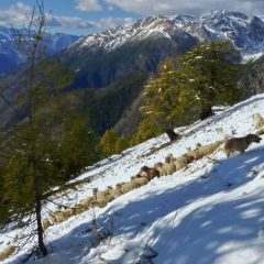 Plus bas, la neige commence à se faire plus rare mais l’autre moitié du troupeau qui n’en faisait qu’à sa tête est encore là, et avec lui, je vous le donne en mille : un patou ! Il n’arrête pas de nous regarder du coin de l’oeil. Lolotte qui est spécialiste en morsures canines ou félines nous dit de tracer sans le regarder. Bon. Finalement on trace, et je reconnais en passant l’un des deux costauds, déjà vu en discutant avec le berger, et qui était redescendu s’occuper des récalcitrants. Ouf, ce n’était donc pas le jeune mangeur de bras d’homme 🙂