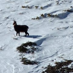 Vierge ? Pas complètement. De temps à autres, apparaissent depuis l’amont ou l’aval des traces fraiches d’ongulés, des chamois, que nous apercevrons à plusieurs reprises sous la cime de Merlier. Je prend un malin plaisir à réutiliser leurs traces un instant, avec le sentiment d’un effort allégé, jusqu’à ce qu’elles bifurquent à nouveau vers la pente, dans une amplitude de saut difficile à concevoir pour les bipèdes humanoïdes que nous sommes.