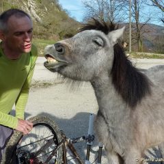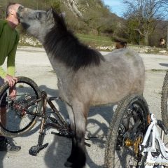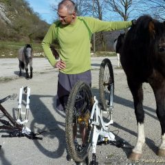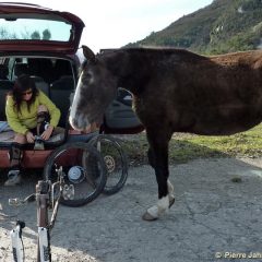 Alors que nous nous mettons en tenue et préparons nos biclous, le dialogue s’instaure rapidement avec tous les membres du groupe, dont le plus jeune est certainement le plus extraverti. On échange d’abord quelques banalités sur la douceur revenue, le réveil de la nature, la beauté intrigante du lieu, puis on répond à mille questions concernant notre équipement. Et que non, on n’utilise pas d’éperons pour faire avancer nos vélos, et que oui, nos selles sont effectivement inconfortables… Ils goutent à peu près à tout : manches de maillot, pneu, sac à dos, chaussure, avec au passage un tour à l’arrière de la voiture, alors que pour une fois, je n’avais pas joint ma traditionnelle carotte à mon picnic. Dommage.