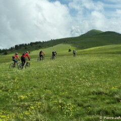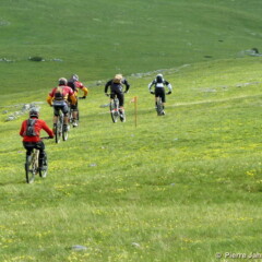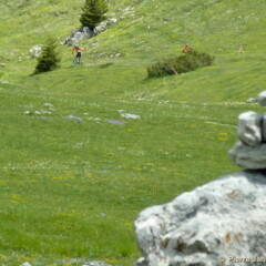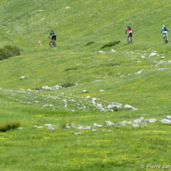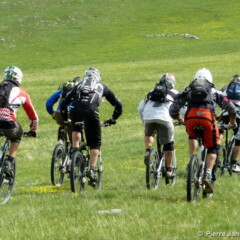 Quant au terrain n’en parlons pas, on a jamais le temps de s’y habituer ! Entre la large prairie alpine du départ, qui a l’immense avantage d’éclaircir les positions, les sentiers encaissés à flanc qui raclent les pédales trop basses, les franchissements de blocs où selon ses capacités, se pose à chaque fois la question : « à pieds, ou en mode trial ? », les coups de cul qui s’enchainent, les wild zones fraichement ouvertes dans les genêts, les franchissements de restanques surprise, les enchainement de pif paf bien raides qui tétanisent les doigts sur les freins bloqués, les sentiers de balcons qui permettent d’aller vite, très vite, avec cependant des passages exposés dans les roches rouges au-dessus de la Tinée, où la sortie de sentier est définitivement interdite… toutes les qualités de vététiste sont pleinement exploitées.