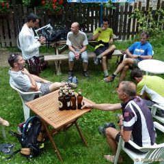 L’excellent diner servi dans l’unique auberge de Chiesa nous met bien en condition, surtout pour trouver un emplacement de camping en pleine nuit noire. Heureusement que les averses orageuses du soir ont cessé, que les corps sont fatigués, et que la partie la plus intégriste du groupe a accepté de jouer le rôle des navetteurs en retournant au point d’arrivée de Chiesa tandis que nous avons gagné +300m de route vers Santa Anna, point départ réel (au sens « non bitumé ») de la boucle.