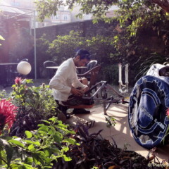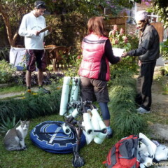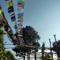 Remontage des vélos express dans le jardin, pendant que le soleil se met à nous réchauffer, avant l’arrivée de Tangi et Florent, jeune vététiste Gapençais de haut niveau et 4ème compère biker du trip. Les sacs à vélo (ChainReaction Cycles) ont bien souffert dans le voyage et ses deux correspondances, mais nos biclous sont entiers, c’est le but. On s’équipe en vitesse pour une première journée acclimatation et découverte sur les hauteurs de Katmandou.