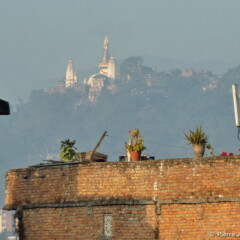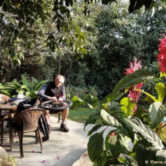21 novembre. Petit déjeuner royal au lever du soleil : porridge aux bananes, thé au gingembre, jus de fruits frais, scrumble eggs… Servi dans le jardin du lodge où nous découvrons petit à petit, et surtout de jour, les images, les odeurs et les sons de Katmandou.