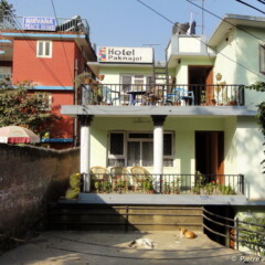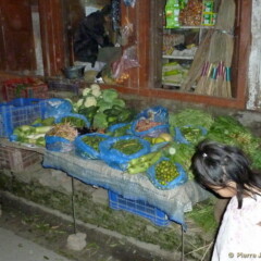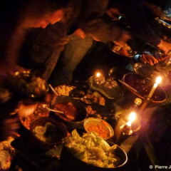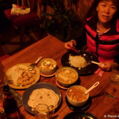 Le quartier est plein de guest houses pour touristes et treckeurs. Logistique Népalaise peu fiable, Tangi a du nous trouver deux chambres à la dernière minute, et après une douche dans la seule bathroom fonctionnelle (lire : avec de l’eau et un mini chauffe-eau à gaz, mais à l’entretien d’un autre âge…), nous prenons tous ensemble notre diner à la bougie, premier d’une longue série de repas locaux délicieux. Ici, un barbecue à l’indienne, au milieu d’une faune assez variée de treckeurs hippies ou vice-versa, dans des volutes de fumée qui font rire.