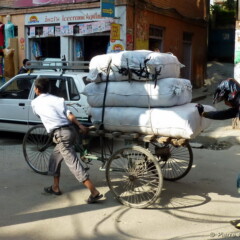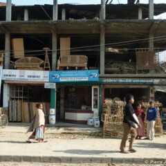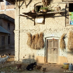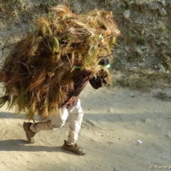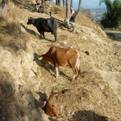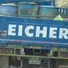 Les « véhicules » sont pour le moins disparates. Il y a les incontournables camions et bus Tata, des constructions Indiennes quasi indestructibles qui transportent soit des passagers dedans, sur le coté et sur le toit, soit du fret, chargés aux limites de la stabilité, le tout assez joyeusement décorés et enjolivés. Il y a les taxis, ces mini japonaises désuètes datant d’une ou deux décennies. Les motos, généralement indiennes ou chinoises, petite cylindrée, mais chargement là aussi maximum, en personnes ou en marchandise. Des vélos les plus improbables, d’origine indienne pour la ville, chinoise pour les vtt, sans doute les plus chargés de tous. Des tricycles, des charrettes avec mini-tracteurs à 2 roues, et plus simplement des gens à pieds, souvent masqués par la taille de leur chargement de fourrage, de bois, ou d’énormes paniers à fruits et légumes tenus d’une sangle passée sur le front, pour la tournée des commerces et marchés. J’oubliais évidemment les vaches (sacrées) qui occupent parfois la moitié de la chaussée, les chiens qui y dorment, les chèvres, buffles, canards et autres poules.
