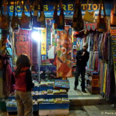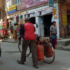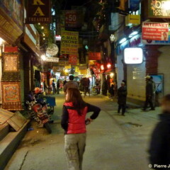 Cette fois, on est vraiment plongés dans le grand bain Népalais. Et après la grosse fatigue accumulée du voyage, l’angoisse de l’arrivée qui cafouille, rouler pour la première fois de nuit dans un Katmandou qui fourmille, coté gauche, avec un éclairage de rue quasi inexistant (toujours les coupures d’électricité), des rues défoncées, des klaxons qui bipent de partout, pas de feus rouges, ni de règles de circulation (en fait si, mais pas visibles du premier coup), au milieu des vélos sans éclairage, des charrettes, des camions, des piétons dans tous les sens…