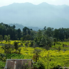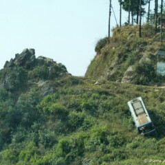 Une main bien accrochée à un truc fixe, tant que l’on est pas complètement habitués au style de conduite de notre chauffeur, et des autres usagers en général… Je vous rappelle qu’ici on conduit à gauche comme en Inde, que les routes n’ont de nom qu’au travers du mince ruban dentelé de bitume, parsemé de nombreux nids de poules, enfin quand il reste encore du bitume, qu’elles sont étroites, puis raides et exposées dès que l’on attaque la montagne, voire à moitié emportées dans les traversées de couloirs déversants. Tout le monde roule en plein milieu, et double au moindre espace, parfois sans visibilité, klaxonne avant, pendant et après.