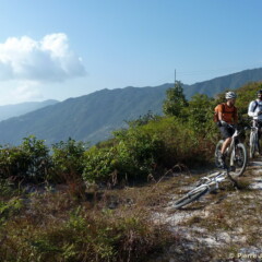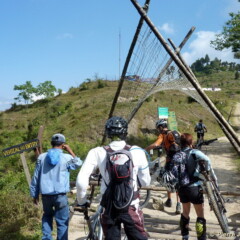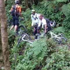 S’ensuit une alternance de descentes ludiques et techniques, agrémentés de pistes à 4×4 finalement très fun car roulantes et constellées de bosses. Nous descendons nos premiers escaliers de terre ou de pierres, il y en aura beaucoup d’autres. Les Népalais aiment les escaliers. La descente finale est une merveille de panorama sur toute la vallée de Katmandou, de technique et d’engagement. Parfois limite pour nos enduros, et pour cause, c’est le futur tracé du championnat de DH Népalais initié par le club VTT de Tangi.