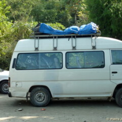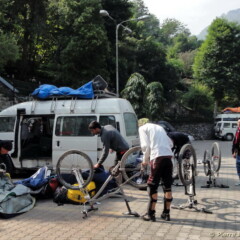 Afin d’optimiser l’espace plutôt réduit du Nissan, pour 5 personnes en plus du chauffeur, les sacs voyagent sur le toit, tandis que nous démontons à nouveau les vélos pour les faire entrer dans leurs sacs respectifs. Le confort est spartiate, mais on est « roots » ou on ne l’est pas !