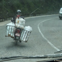 Une chicane en blocs de pierre grossièrement peints, une barrière en bambou, un groupes de préposés derrière une table en bois hors d’âge posée à même la terre, un échange de petites coupures sans un mot : nous venons de passer le péage pour l’autoroute. « Chouette, ça va nous remonter la moyenne ! » Mais dès les premiers virages d’une route à deux voies légèrement plus large qu’à l’habitude, on réalise qu’il n’en sera rien, et que la seule accélération sera celle de notre rythme cardiaque !