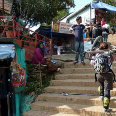 J’en oublie d’ailleurs de déclencher ma caméra de casque, alors que nous empruntons une ruelle étroite bondée d’étalages et de vie locale. On ne le savait pas encore, mais la ruelle en question est une succession sans fin de marches et de petits escaliers plus ou moins raides, dans lesquels nous faisons le spectacle, du moins pour les enfants.