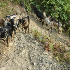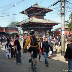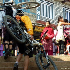 Grandes descentes certes, mais pas sans quelques coups de cul (appelés simplement « culs » par Tangi 🙂 ), et portions de pédalage, notamment à l’arrivée sur la plaine de Pokhara. De la pente herbeuse, des sauts, des enchainements ravinés, de la piste mach 2, du balcon, des… escaliers (!), du sous-bois presque comme dans la Valmasque… mais avec les singes en plus, des temples, des restanques, des rizières, des buffles, des vaches, des chèvres, des poules, et des finals dans les ruelles/sentiers de la banlieue pauvre de la ville.