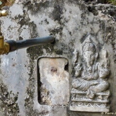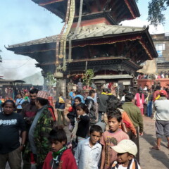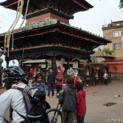 La place du temple nous laisse sans voix. Entre la bâtisse antique et austère envahie par les pigeons, le brouhaha des pèlerins, des cloches, des marchands (du temple) ou des simples touristes, des prières, avec l’odeur du sang et la fumée des sacrifices en cours, les pelotes de fils électriques qui traversent le lieu de part en part, les enfants et curieux qui nous observent nous équiper pour la descente à venir, on ne réalise plus trop où l’on est, comme si nous débarquions d’une autre planète.