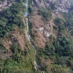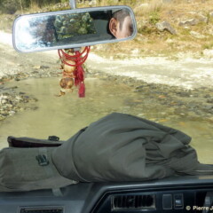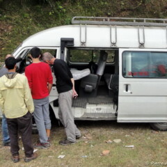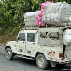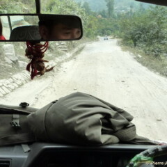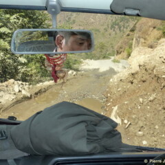 Une fois sortis du plateau, la route se fait plus sinueuse et étroite, tandis que le bitume finit par disparaitre complètement. Le reste n’est que trous et bosses, ornières, voie réduite par des glissements de terre en amont, ou de morceaux de piste vers l’aval. On avance donc lentement, mais notre chauffeur, pour sa dernière course avec nous, maitrise toujours aussi bien son affaire.