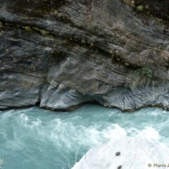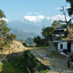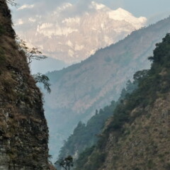 Tandis que le soleil décline rapidement derrière les parois de gorges de plus en plus profondes et resserrées, on voit furtivement des sommets rosés apparaitre dans le fond, mais haut, très haut : le Nilgiri est ici, les Annapurna sont là !