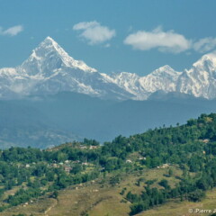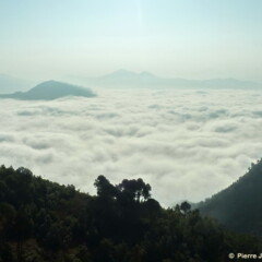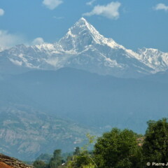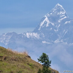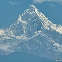 Tangi avait prévu cette deuxième journée avant d’attaquer le plat de résistance de la grande montagne. Le temps était beau et doux. Nous avons largement profité des navettes avec le van, pour refaire des descentes de la veille ou en tester de nouvelles, avec notamment un départ matinal au-dessus de la mer de nuages, toujours sous la protection permanente de la montagne sacrée, le très esthétique « Cervin Himalayen » : le Machhapuchhare (6993m).