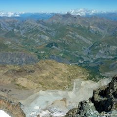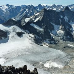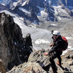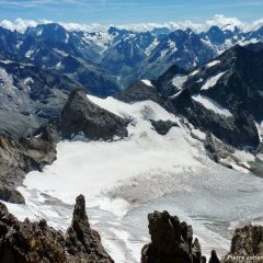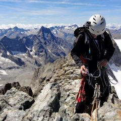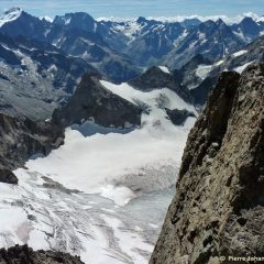 Là-haut, nous tenons tout juste sur la minuscule plate-forme, heureusement libérée des cordées précédentes, et mitraillons et filmons à tout va tel un groupe de touristes japonais bien entrainés, le magnifique spectacle du massif des Ecrins qui s’étend à nos pieds.