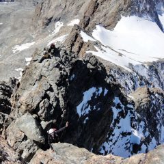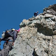 Nous arrivons ainsi à la brèche précédant le ressaut qui conduit au sommet où Thierry propose de nous faire emprunter la voie directe du pilier, plutôt que de contourner le ressaut par une vire face sud (voie classique). Entre temps, Laurent et Franco décident d’en rester là dans l’ascension, et de nous attendre sur une petite plate-forme, car l’idée de passer en mode escalade pure ne les branche pas plus que ça !