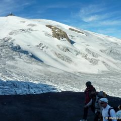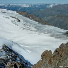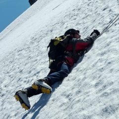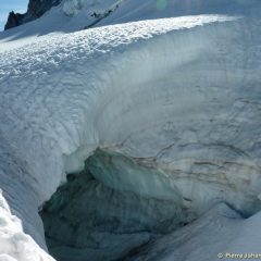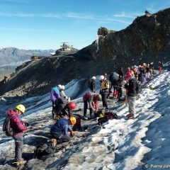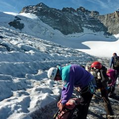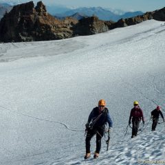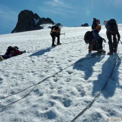 Après quelques pas à la sortie de la gare du téléphérique, on chausse les crampons au bord du glacier, on vérifie les baudriers, et on installe les cordées. Départ sur la neige à peine ramollie, par un grand contournement de la rimaye du glacier par la droite, suivi d’une forte pente pour parvenir au col de la Girose à 3518m, le souffle court.