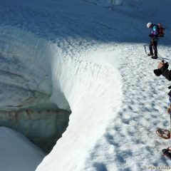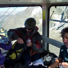 Puis le retour nous impose quelques détours pour éviter les ponts de neige, très fragiles à cette époque de la saison. Avant de regagner la gare du téléphérique peu avant la fermeture et accompagnés par un flot de touristes venu humer l’air de l’altitude et visiter la grotte de glace.