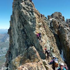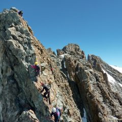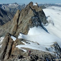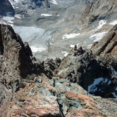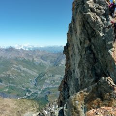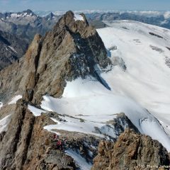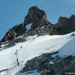 Nous y ôtons nos crampons pour attaquer l’arête rocheuse facile mais aérienne puisqu’elle domine, le glacier de la Selle d’un coté et celui de la Girose de l’autre, de quelques centaines de mètres. Tout se passe bien, lentement mais surement, tandis que nous sommes doublés par deux cordées encadrées de guides au rythme syndical.