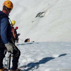 Pour la descente du glacier, Patrick décide de nous faire passer la rimaye contournée à l’aller. Tout va bien jusqu’à ce que la première cordée se retrouve dans la partie à très forte pente, exposée nord, et donc gelée sous la fine couche de neige. Deuxième séquence « émotion » de la journée.