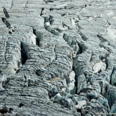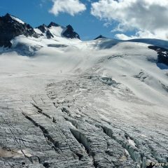 Nous voici donc à apprendre les techniques de glace « sur le tas » ! Se tourner face à la pente, planter vigoureusement les pointes avant de nos crampons à chaque pas descendant, faire de même avec le piolet (moins évident qu’il n’y parait) avant chaque transfert de pied. A ce jeu les trois cordées perdent beaucoup de temps alors qu’il est impératif de ne pas louper la dernière benne pour le retour à la Grave, sous peine d’une marche de 1800m négatifs avec nos godillots rigides !