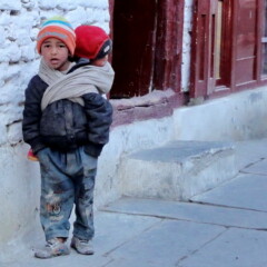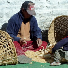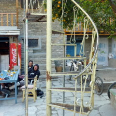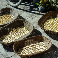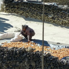 Dans la cour ensoleillée du lodge, séance animée d’entretien de nos vélos qui ont souffert avec cette poussière ultra fine omniprésente. Les enfants passent par dizaines sur la ruelle surplombante et, curieux, s’attardent devant notre groupe affairé, tandis que Susie joue à la maman avec ceux de la maisonnée. De larges paniers d’osier couverts de quartiers de pommes sont exposés au soleil, ces fruits secs sont un délice absolu et idéals dans le sac pour nos efforts quotidiens. Assis contre le mur chauffé pa le soleil, un homme égraine patiemment les épis de mais séchés.