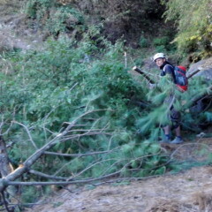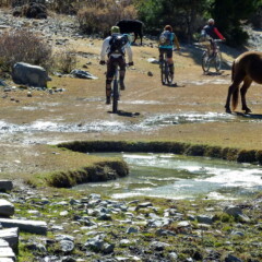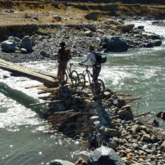 Le parcours du jour nous fait d’abord passer d’une rive à l’autre de la rivière à travers les plantations locales, puis nous rattrapons la piste défoncée du Mustang que nous avions empruntée à la montée. Une option envisagée par Tangi est vite abandonnée, car la passerelle provisoire au-dessus du bras principal de la rivière n’a pas été rétablie après la dernière crue, et, heureusement pour nous, la tentative de Florent pour passer le courant gelé à pieds n’est pas des plus concluante.