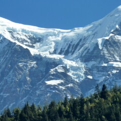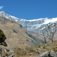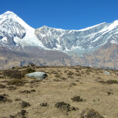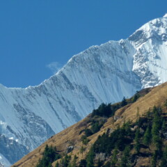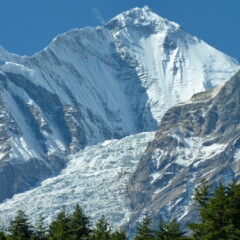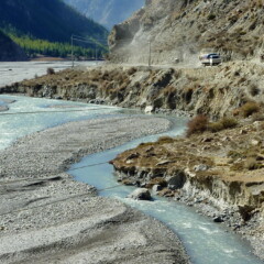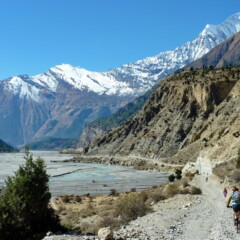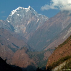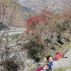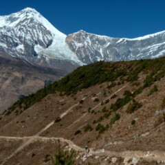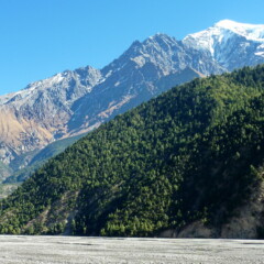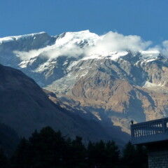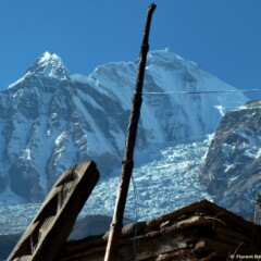 Dans une anse de la rive droite, nous montons finalement par une piste fraichement bulldozzée, au bout de laquelle apparaît — contraste extrême comme on en trouve que dans ces pays — d’un côté un hôtel luxueux sur un promontoire avec vue à 360°, pelouse rasée de près et statues de pierre, et de l’autre côté un village perdu, dont les habitants semblent vivre encore comme un siècle en arrière. Juste au-dessus, le vallon béant du glacier du Daulaghiri, si près, et pourtant si haut, qui semble régurgiter sa glace comme un volcan sa coulée de lave.