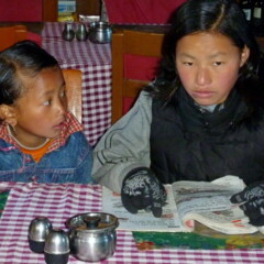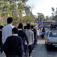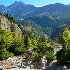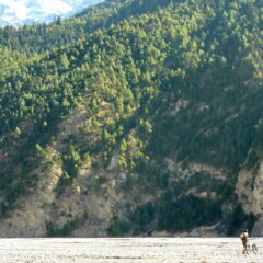 Pour cette dernière journée, nous repassons en rive gauche de la rivière pour une longue montée sur piste, parmi une forêt de pins qui rappelle furieusement nos lointaines Alpes du Sud. Au passage d’un petit village, une nuée d’enfants tentent de s’accrocher ou grimper sur nos vélos en marche, et il faut user de persuasion pour leur faire cesser ce jeu dangereux.