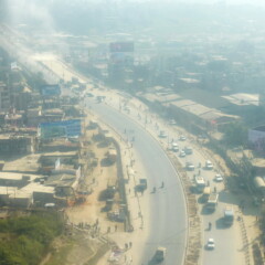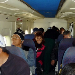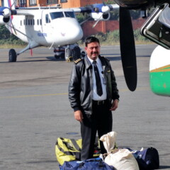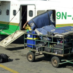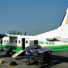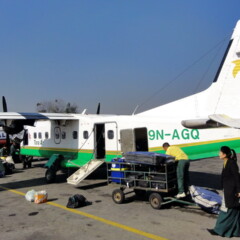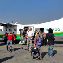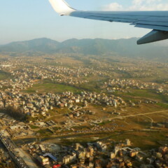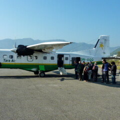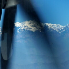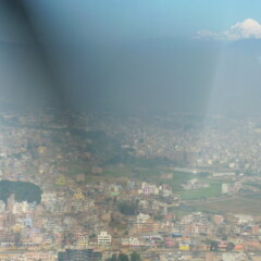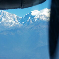 Le petit bi-moteurs de Tara Air ne transporte qu’une vingtaine de passagers, avec une hôtesse s’il-vous-plait, mais nos sacs vélos remplissent quasiment la soute, d’autres sacs voyageront dans la cabine du pilote ! Un vol panoramique qui nous ramène en moins d’une heure à Katmandou, dans la brume de pollution ambiante, au milieu des chaines de montagnes qui caressent le ciel.