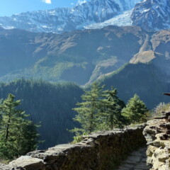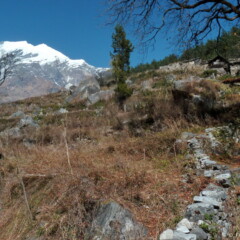 Nous finissons par lever le camp… (ah, non, Astérism a encore oublié un truc de dernière minute 😉 ) pour reprendre la ruelle pavée principale, sous laquelle coule une eau tumultueuse en provenance directe du glacier du Daulaghiri tout proche, emprunter les sentiers surélevés et dallés qui serpentent au milieu des cultures de la vallée, en cassant la fine glace formée sur les flaques durant la nuit.