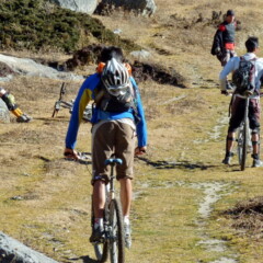 La ruelle qui sort du village débouche immédiatement sur un bon sentier bardé d’épingles techniques et qui nous ramène jusqu’à la rivière, un pont Népalais, puis à nouveau la piste du Mustang avec son trafic de bus indiens surchargés, de 4×4 taxis, de motos, et de troupeaux. Le monta cala est toujours présent, mais dans le sens de la descente cette fois, ce qui nous permet de belles pointes de vitesse, et des dépassements osés.