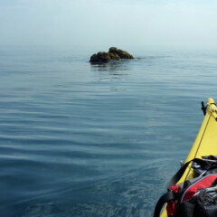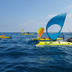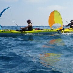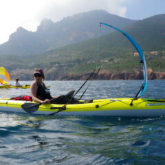 La deuxième sortie à 6 bateaux était également une première pour nous, avec la découverte de la voile d’appoint en kayak de mer, avec la « spoon » dite aussi « flip-flap » commercialisée par Bic, et dont le concepteur est également l’organisateur de cette dernière rando aquatique.