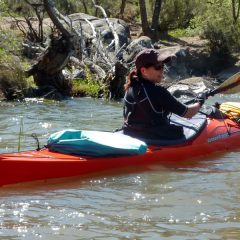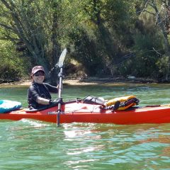 Les premiers coups de pagaie sont timides, d’autant plus que nous nous retrouvons enfermés, par opposition aux « sit on top » du début, le torse bordé d’une « jupe » en néoprène que l’on découvre aussi comme tout le reste. Le vent fort n’aide en rien, et Susie rend plusieurs fois visite aux roseaux et à la berge, avec un esquif qui n’en fait qu’à sa tête.