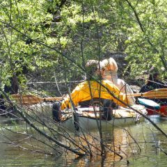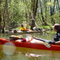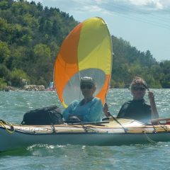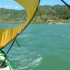 Nous découvrons à chaque sortie l’extrême polyvalence de ces kayaks de mer. Nous voici naviguant dans un espace que nous pensions réservé à nos randonnées VTT : la forêt ! C’est donc pique-nique cul dans l’herbe que nous partageons paresseusement, avant d’embarquer à nouveau pour retrouver le bras principal du lac, non sans avoir préparé méticuleusement nos voiles Bic spoon (ou Flip Flap) pour le retour pleine bille au portant.