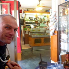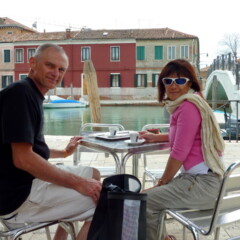 Kirsten qui connait le coin nous propose de débarquer dans un parc au nord de l’île, juste derrière le très beau cimetière. Un escalier pour débarquer facilement et une pelouse pour y poser les bateaux. Nous les laissons ainsi le temps d’une visite de l’île agrémentée d’un déjeuner dans un café typique sur le rio dei Vetrai, l’artère piétonne et navigable principale, où les échoppes de verrerie d’art et les restaurants s’enchaînent comme des perles sur un collier.