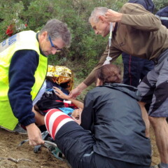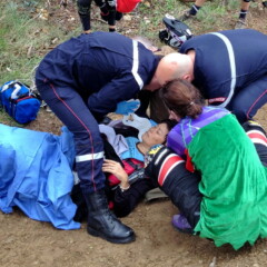 Après une longue attente où j’ai tremblé comme une feuille malgré des tonnes de vestes, la couverture de survie périmée de Bourriquet (si, si, je m’en souviens 🙂 ), et de sachet chauffant de Nath, je crois, arrivent enfin les pompiers puis le médecin de garde. En quelques minutes, j’étais dans les nuages, shootée à la morphine, l’oxygène et bercée par une mélodie de sirène.