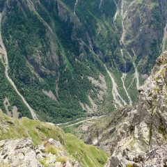 La boucle au départ du Chazelet rejoint le plateau d’Emparis par la piste jusqu’à la baraque de la Buffe où débute le portage, toujours sous l’oeil de la Reine Meije et de ses glaciers. Puis on contourne l’immense plateau jusqu’au col St Georges où on emprunte le GR54 et la boucle des lacs via un petit portage costaud qui vaut néanmoins le détour pour les lacs, mais aussi pour la vue vertigineuse – 1200m d’à-pic – sur la vallée de la Romanche.